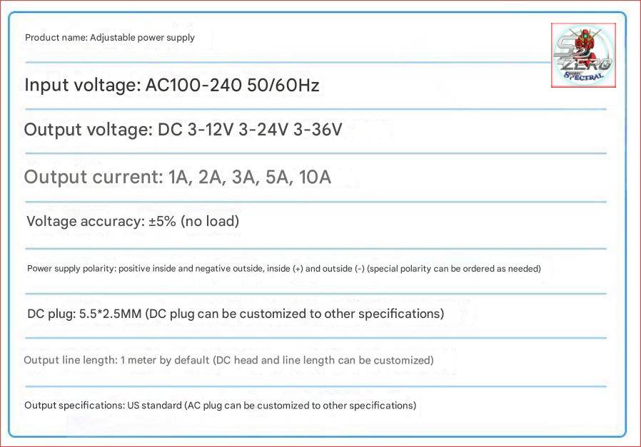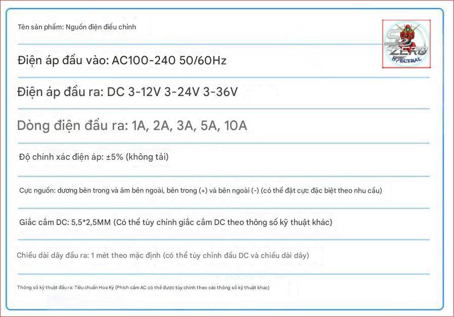 Điện Áp đầu ra:3.6V 4.5V 5V 6V 7.5V 9V 12V 13V 13.5V 14V 15V 17V 18V 20V 21V 22V 23V 24V